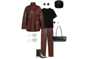 Outfit with a brown leather jacket, black fuzzy sweater, and leather pants