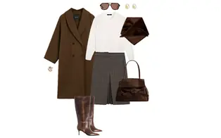 Outfit with a brown coat, checked midi skirt, and leather boots