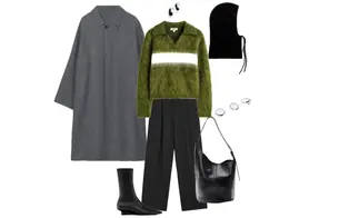Outfit with a gray oversized coat, green fuzzy sweater, and black tailored trousers