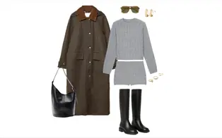 Outfit with a brown waxed coat, gray cable-knit set