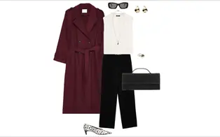 Outfit with a burgundy trench coat and white sleeveless knit top