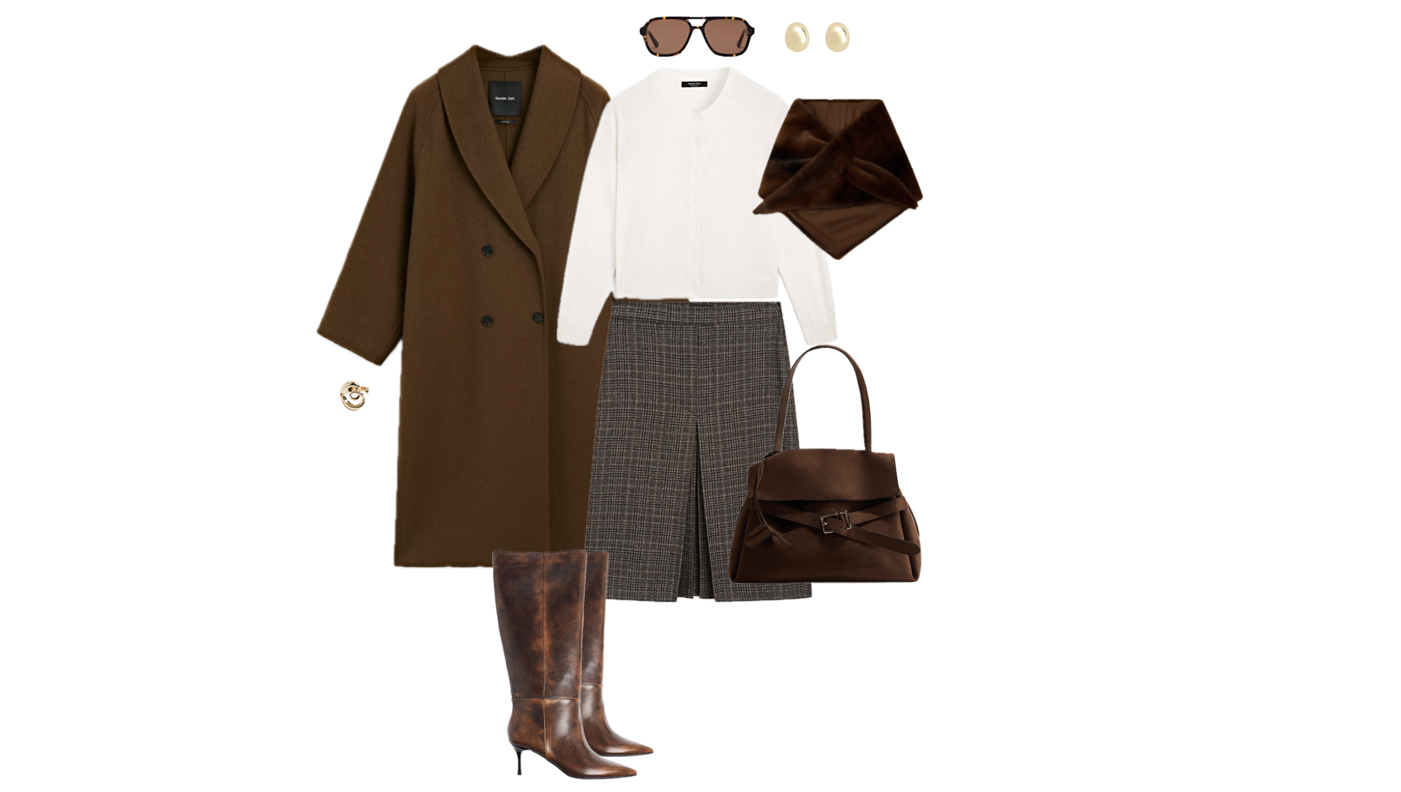 Brown Faux fur scarf. This accessory instantly adds warmth and luxury. Wear it over a wool coat or blazer for texture and elegance. You can drape it around your shoulders over an evening dress to add glamour. For a chic city look, style it with a turtleneck and wide-leg trousers, letting the scarf be the statement piece. It also looks stylish when combined with a minimalist outfit — such as a long-sleeve top and straight jeans — bringing softness and contrast to the silhouette.