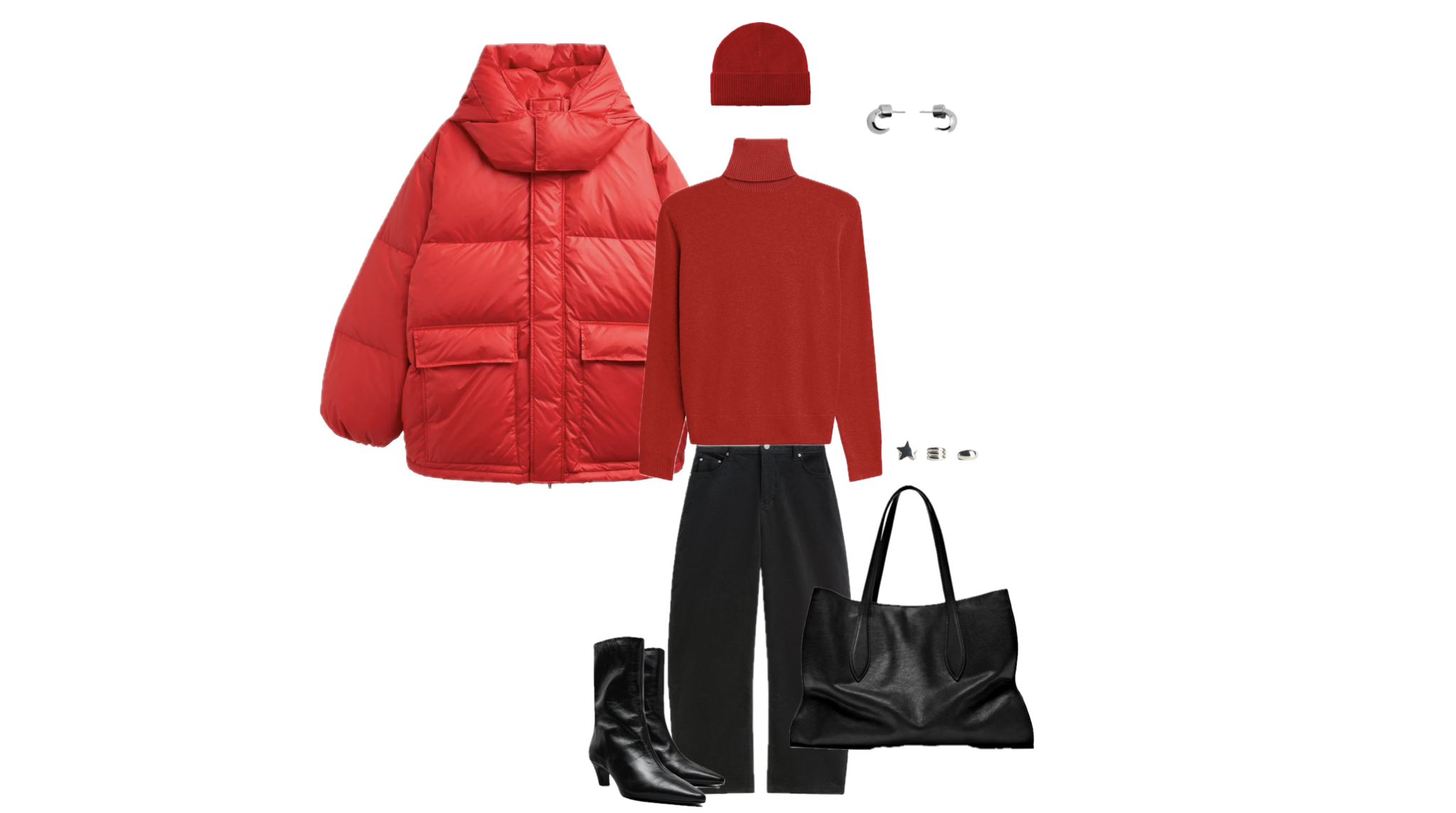 Outfit with a red puffer jacket and a red turtleneck