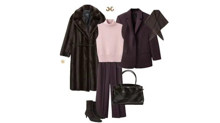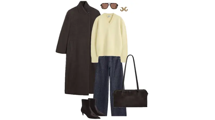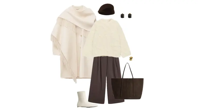 Outfit with a cream poncho coat and wide-leg brown trousers