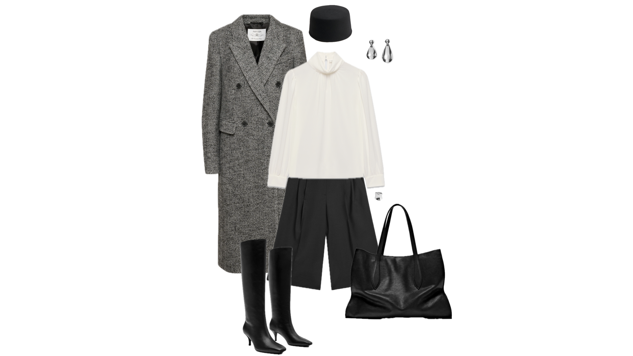Outfit with a grey herringbone coat and a white high-neck blouse