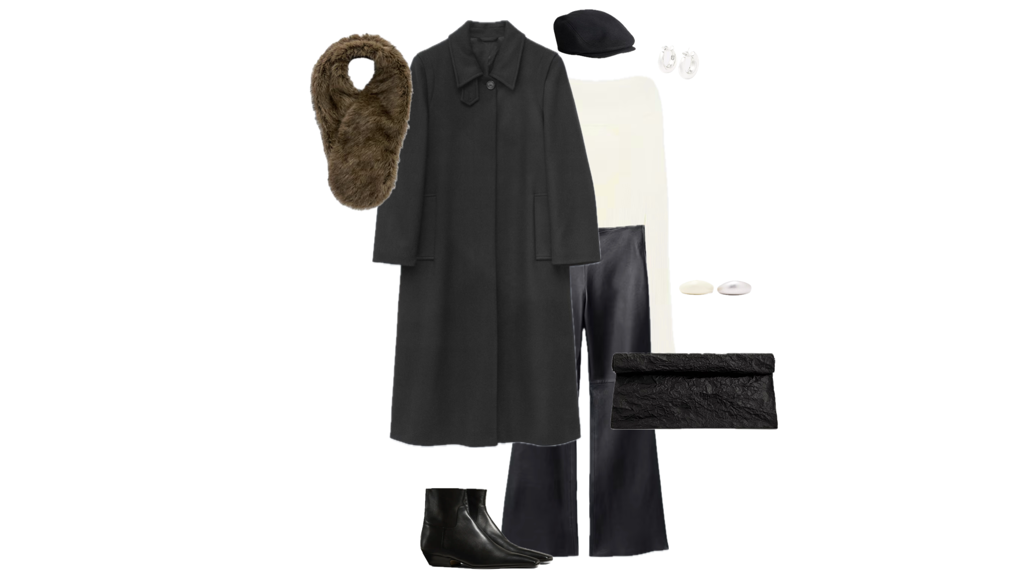 The Black Wool Coat can be styled with straight-leg denim, a cashmere turtleneck, and loafers for a polished everyday look. For evenings, pair it with a slip dress and heeled boots to keep the silhouette refined and minimal.