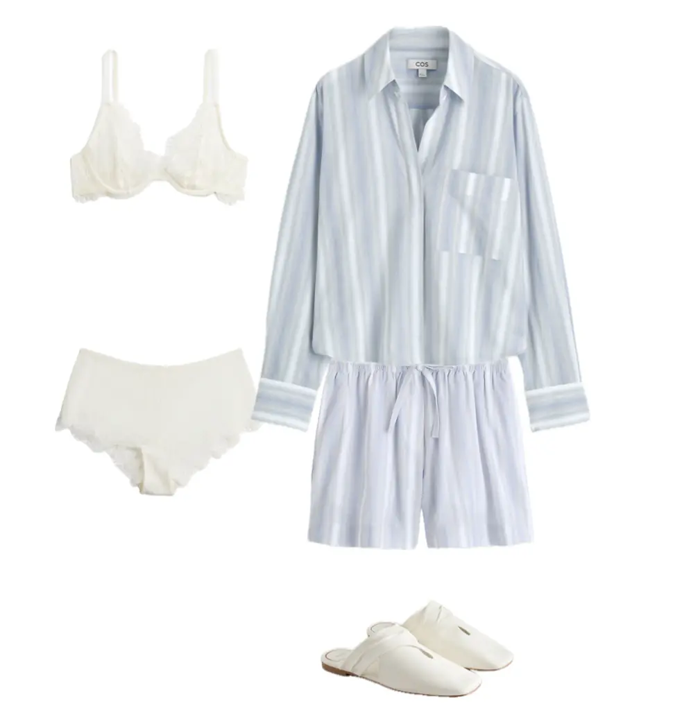 Outfit with a Satin Blue Pajama Set with Contrasting Stripes