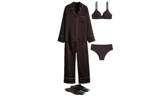 Outfit with a dark brown pajama set and shearling-lined slippers