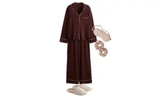 Outfit with a burgundy pajama set and quilted slippers
