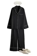 A chic Pajama set that effortlessly transitions between cozy nights and stylish home lounging. The pants can be paired with a T-shirt or sweater for relaxed indoor wear, or styled for a quick coffee run or a casual stroll around the neighborhood. For footwear, opt for mules or ballet flats, with the added charm of furry or fluffy options.