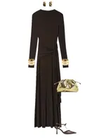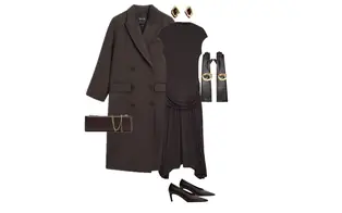 An outfit featuring a deep brown dress paired with gold metal accessories