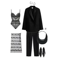 Total Black Outfit with a Structured Double-Breasted Blazer and a Statement Lace Skirt