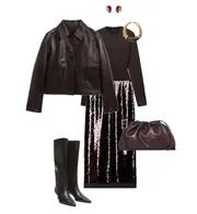 An outfit with a patent leather blazer and an iridescent burgundy skirt
